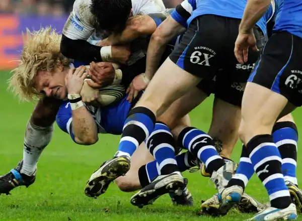 Том Биггс (слева) из Бата и Пол Бош из Монпелье в матче по регби в Бате. (Tom Hevezi/AP)