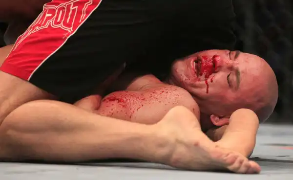Кайл Кингсбери не может понять, что хуже – разбитый нос или то, что Стивен Боннар сидит у него на лице в матче по смешанным боевым искусствам в Сан-Хосе. (Jeff Chiu/AP)