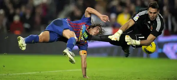 Карлес Пуйоль из «Барселоны» пробивает через Роберто из «Сарагосы» в матче испанской лиги по футболу в Барселоне. (Lluis Gene/AFP/Getty Images)