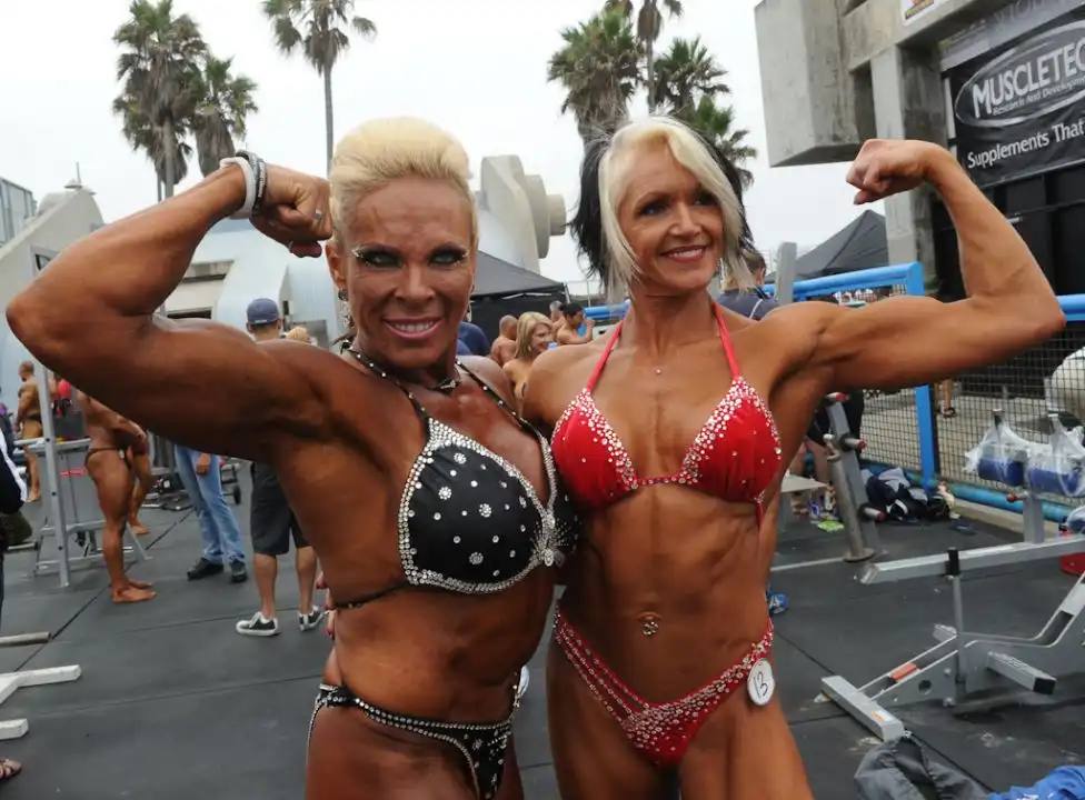 Бодибилдерши Лорен Пауэрс (слева) и Мэир Брэндон (справа) на ежегодном конкурсе бодибилдинга и бикини в Лос-Анджелесе, 6 сентября 2010 года.