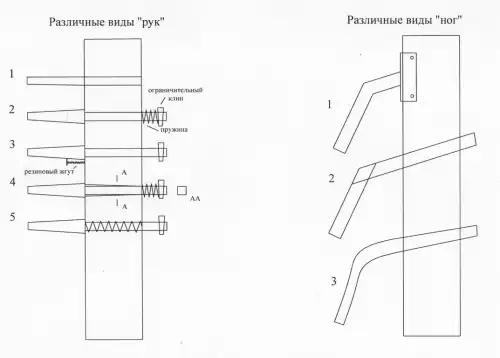 Более сложные варианты имеют встроенные, либо вынесенные пружины, которые обеспечивают движения "рук" в продольной плоскости. Часто палки делают квадратными в сечении, и вставляют в отверстия несколько большего размера. Такие руки имеют ход и в поперечной плоскости. Сложность изготовления таких рук заключается в необходимости долбить отверстия под них вручную стамеской.