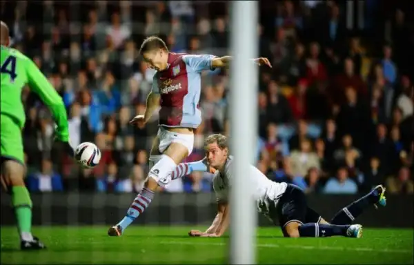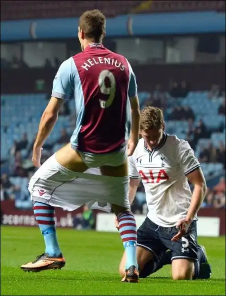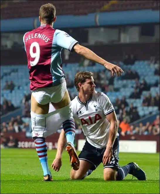 Защитник «Тоттенхэма» постарался любой ценой остановить атаку нападающего «Астон Виллы».