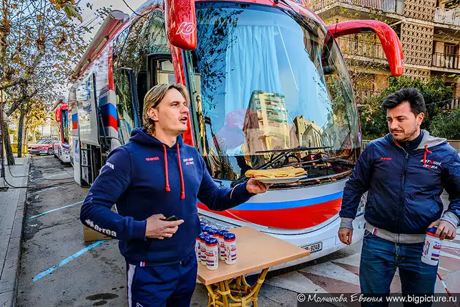 На фото один из двух автобусов команды – ее передвижной “штаб”.