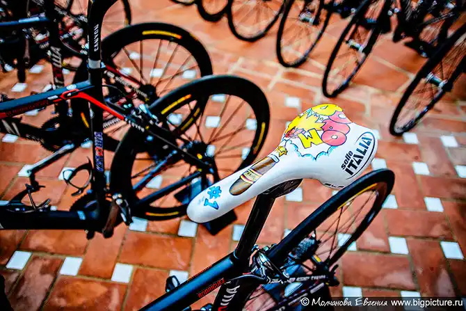 Конечно же команда не может функционировать без такого важного звена как техподдержка – механики “Катюши” всегда на подхвате, и работы у них хватает – они должны постоянно поддерживать “боевых коней” велогонщиков в идеальном состоянии. Каждый велосипед в парке команды – именной, «подогнанный» под определенного гонщика.