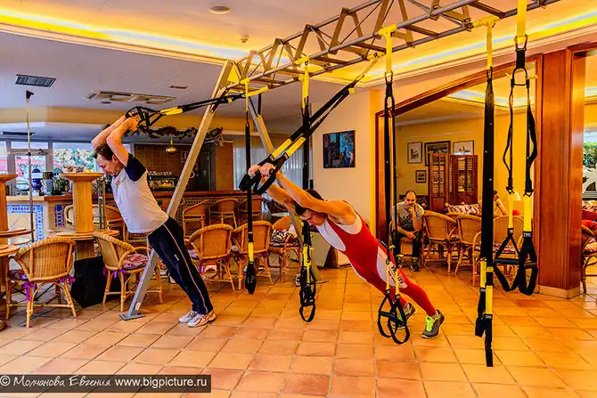 Замысловатую тренировочную систему TRX установили прямо в баре отеля. На одной из стоек внушительного тренажера красуется надпись-девиз: «Сделай из своего тела машину».