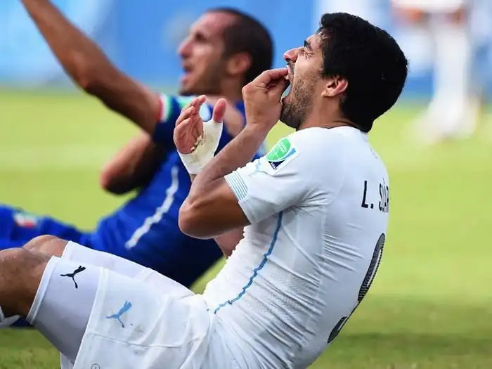 Форвард сборной Уругвая Луис Суарес вновь был наказан судьей за неспортивное поведение во время игры. Все дело в том, что во время борьбы за мяч с Джорджо Кьеллини, играющего за сборную Италии, Суарес не смог удержаться и укусил итальянца ;) Что самое забавное, это уже не первый случай за последнее время, когда Луис нападает на игроков и пытается их укусить )) Напомню, что в числе уже укушенных жертв Суареса на клубном уровне стал защитник "Челси" Бранислав Иванович.