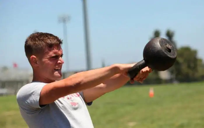 Это упражнение укрепляет те мышцы пресса и торса, которые обычно при занятиях с железом не получают нужную нагрузку, но важны при выполнении различных движений от прыжков до спринта. Возьмите гирю двумя руками, вес тела перенесен на пятки, спина прямая. Заведите гирю между ног и плавно, но быстро выпрямитесь, и выведите гирю на уровень груди.