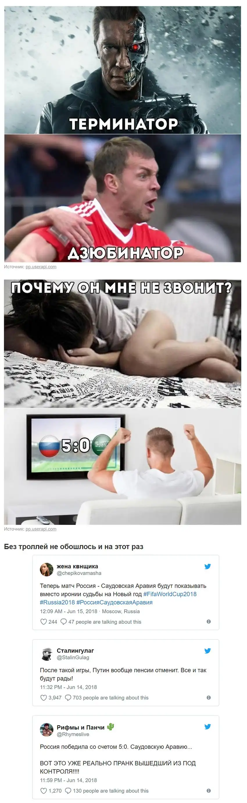 Сборная России с победы стартовала на домашнем чемпионате мира. В первом матче, который состоялся в столичных "Лужниках", команда Станислава Черчесова разгромила Саудовскую Аравию - 5:0. Интернет-общественность отреагировала незамедлительно.