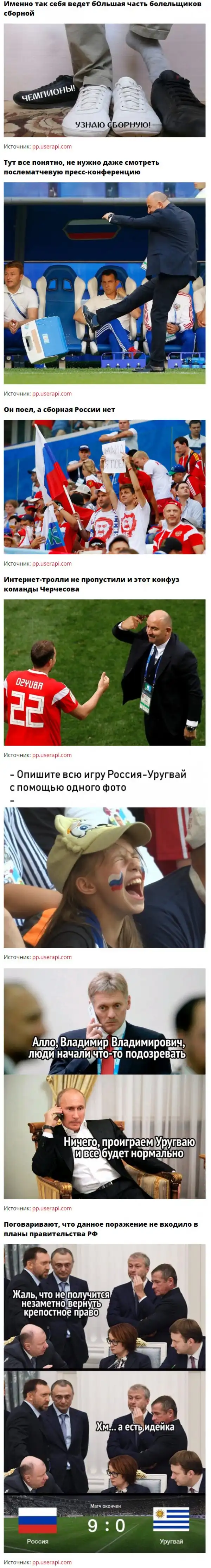 Вот и все, закончилась победная серия сборной России по футболу. Проигрыш команде Уругвая просто взорвал интернет. Недовольные российские болельщики строгают унизительные мемы и высказываются по поводу слабой игры команды Черчесова.