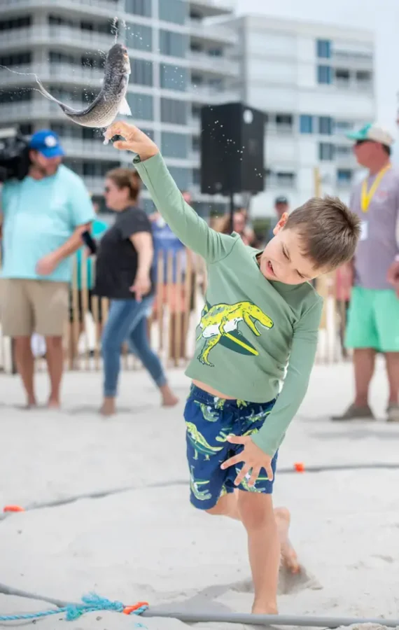 На пляже Флора-Бама толпы зрителей наблюдают, как участники швыряют рыбу кефаль через границу между Флоридой и Алабамой. Рыбу потом жарят и угощают всех желающих.