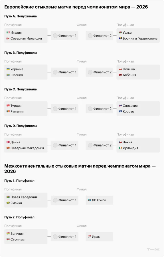 Стыковые матчи. На данный момент известно 42 из 48 участников ЧМ-2026. Оставшиеся шесть путевок разыграют в стыковых матчах: 16 европейских сборных поборются за четыре места, ещё два места достанутся шести командам с остальных континентов. Игры пройдут в конце марта.