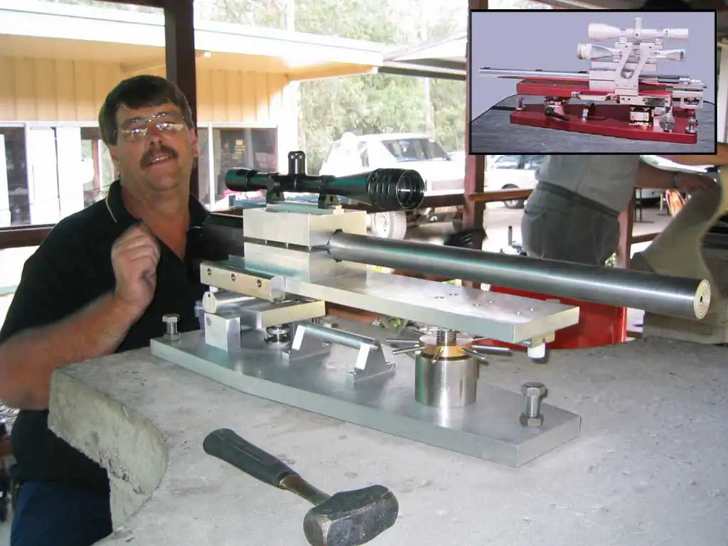 Стол для бенчреста с установленной винтовкой в специальном упоре.