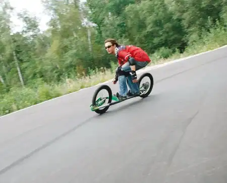 Прежде чем залезть на дертсерф, я прочитал множество рассказов довольных новичков, выслушал массу оптимистичных обещаний своих наставников, но все равно слегка беспокоился. Для начала я попросил Сашу подставить мне дружеское плечо, чтобы потренироваться вставлять переднюю ногу в крепление (задняя нога всегда остается пристегнутой). Во время одного из моих упражнений Саша вдруг толкнул меня вперед, побежал, разгоняя доску все сильнее и сильнее, и наконец отпустил. Перестав извергать проклятия сквозь шлем, я поймал себя на мысли, что довольно уверенно еду на дертсерфе. Увидев приближающиеся ступеньки, я заставил себя сосредоточиться, отклониться назад и нажать на рычаг тормоза. Дертсерф плавно остановился и позволил мне опустить переднюю ногу на землю.