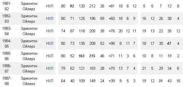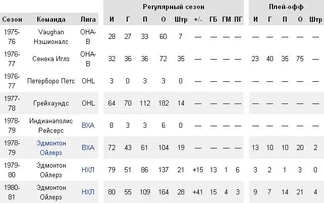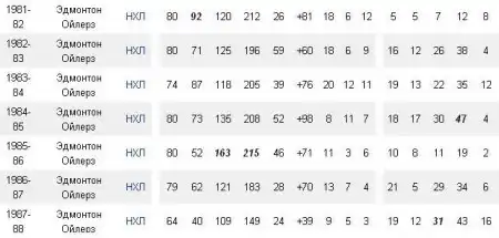 Наибольшее количество голов, за один сезон, включая плей-офф: 100 в сезоне 1983-84, 87 голов в 74 матчах регулярного чемпионата и 13 голов в 19 играх плей-офф