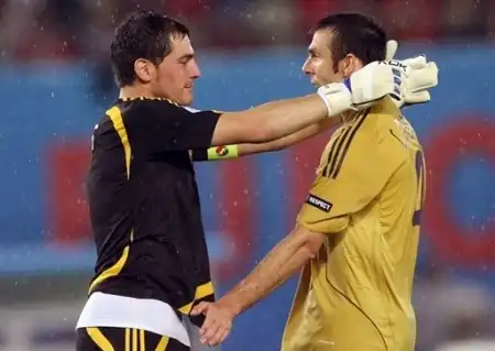 Атаки на испанскую сторону большей частью развивались справа, где Саенко раз прострелил, в другой - заработал угловой, и выглядел активно в нападающих акциях. Однако без ударов по воротам. Чего не скажешь об испанцах. Результаты усиленно отрабатываемых испанцами на тренировках дальних ударов ярче всего демонстрировал Вилья. Именно он пробил из-за пределов штрафной после паса Сильвы. В следующем эпизоде он бил уже со "стандарта". Активность сослужила ему злую шутку. Произошла замена. Вместо Вильи, получившего травму во время исполнения стандарта. Сильва переместился в центр, а Иньеста на правый фланг.