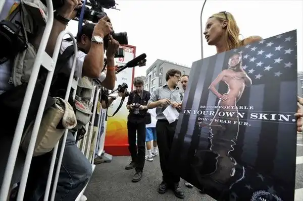 На плакате — обнаженная Аманда Берд, стоящая на коленях в воде на фоне американского флага. Слоган на баннере гласит: Be comfortable in your own skin. Don’t wear fur. («Чувствуйте комфорт в собственной коже, не носите мех!»).