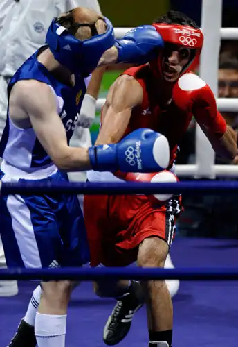 Олимпийский чемпион Афин Алексей Тищенко (в синем шлеме) хорошенько помял армянина Грачью Джавахяна в полуфинале олимпийского турнира.