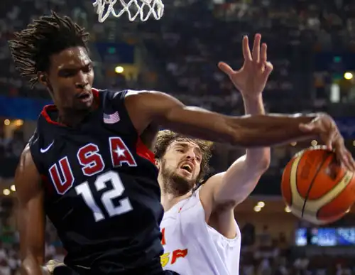 Американец Крис Бош отвоевывает мяч у испанца По Газоля и приносит своей команде заслуженную победу в искрометном финале.