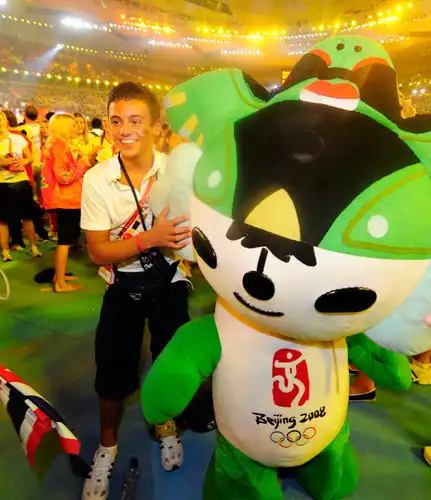 14-летний британский вундеркинд, прыгун в воду Том Дэйли фотографируется на память с талисманом Игр.