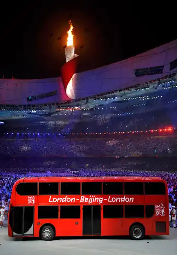 Знаменитый красный лондонский автобус на стадионе «Птичье гнездо». Через 4 года Игры пройдут в Европе – в столице Великобритании.