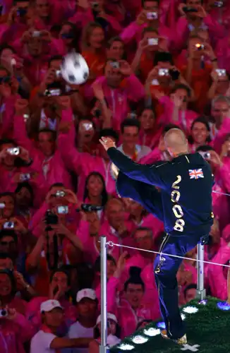 Дэвид Бекхэм запускает мяч мужественным волонтерам, которые две недели трудилиись на благо спортсменов и тренеров.