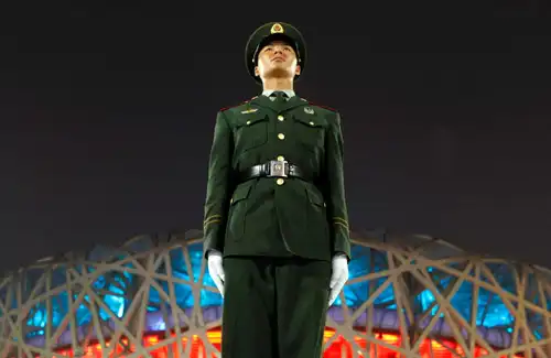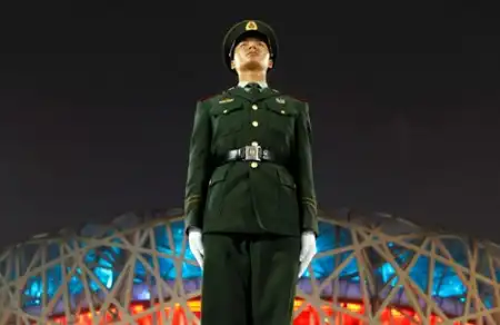 Фотосимвол: вымуштрованные охранники, словно оловянные солдатики, следят за порядком на главном олимпийском стадионе «Птичье гнездо».