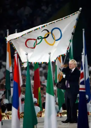 Мэр Лондона Борис Джонсон с олимпийским флагом в руках.