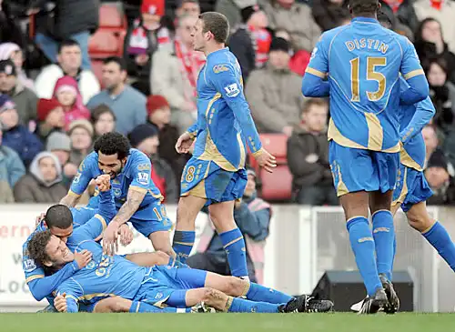 Что может быть радостнее, когда твой соперник на последней минуте матча срезает мяч в собственные ворота? Игроки "Портсмута" радуются автоголу Райана Шаукросса - 2:2.