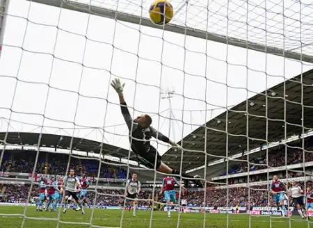 Голкипер "Вест Хэма" Роберт Грин не может помешать состояться голу со штрафного, исполненного полузащитником "Болтона" Мэттом Тэйлором.