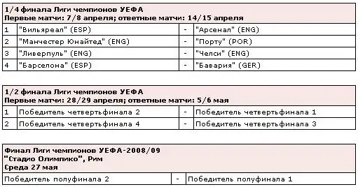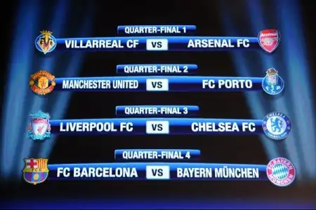 Без сомнения, схватка "Ливерпуля" с "Челси", которые делят второе и третье места в чемпионате Англии, имея по 61 очку, станет лакомым блюдом для любителей европейского футбола. За четыре последних сезона эти команды трижды встречались в полуфинале, и пока что преимущество на стороне красных: две победы против одной. Но и остальные пары тоже обещают в высшей степени интересный футбол. У "Вильяреала" старые счеты с "Арсеналом", так как "канониры" выбили испанцев в полуфинале-2005/06, когда Хуан Роман Рикельме не забил пенальти на 90-й минуте ответного поединка. "Манчестер Юнайтед" сыграет с "Порту", которому уступил в 1/8 финала в победном для "драконов" сезоне 2003/04. А битва "Барселоны" с "Баварией" станет битвой двух самых забивных команд этого сезона: на счету обеих по 24 гола в Лиге.