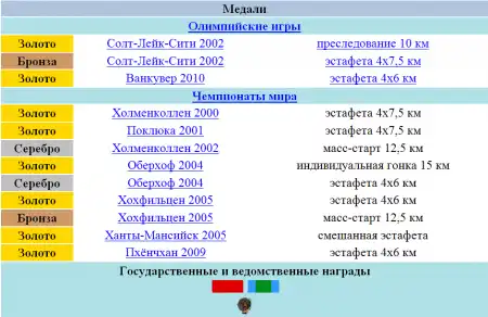 На Олимпийских играх 2002 в Солт-Лейк-Сити выиграла золотую медаль в гонке преследования на дистанции 10 км, а также выиграла бронзовую медаль вместе с российской эстафетой. На чемпионатах мира она в 2004 завоевала золото на дистанции 15 км и бронзу в масс-старте в 2005. С эстафетой она четырежды становилась чемпионкой мира (2000, 2001, 2005 и 2009), а также вице-чемпионкой в 2004.