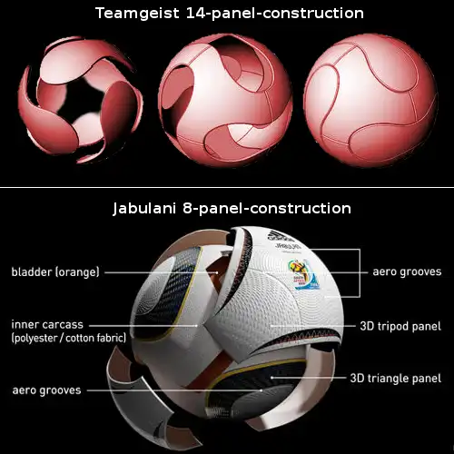 Впервые за 36 лет компания adidas отступила от классического 32-панельного дизайна. Каркас и панели, соединенные по технологии термосклейки, обеспечивают водонепроницаемость и более ровную поверхность, повышающую результативность ударов. Рисунок выполнен в черно-белой гамме – традиционных цветах немецкой сборной, с золотой окантовкой – символом Кубка мира, и покрыт прозрачным защитным слоем. Teamgeist означает "командный дух".