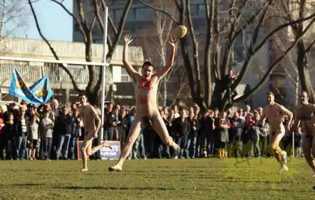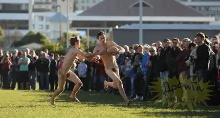 В пригороде новозеландского Данедина, в парке Логан, прошел "голый матч" регбистов. Проведение таких игр, под эгидой Университета Отаго, стало традицией: дунединцы и их соперники обнаженными выходят на поле для регби накануне отборочного матча звезд из новозеландской команды "All Blacks" против команды гостей.