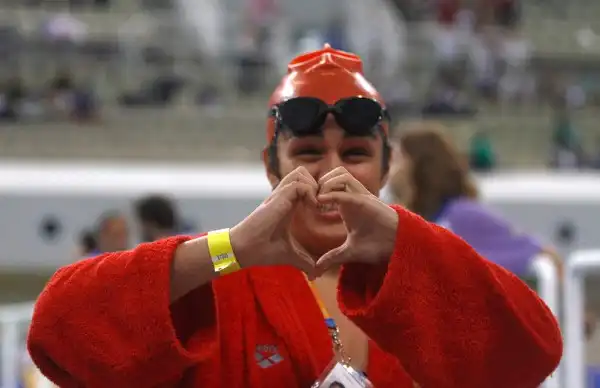 Мария Пачи переживает за сына Николаоса Костополуса из Греции, участвующего в заплыве на 25 метров брассом.