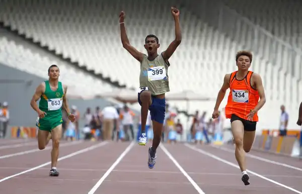 Юный спортсмен из Шри-Ланки радуется победе в забеге на 100 метров на летних играх в Афинах 29 июля.