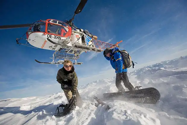 В принципе это тот же самый фрирайд, только более опасный и более дорогой. Вертолет доставляет группу сноубордистов и лыжников на склон горы. Спрыгивая с борта судна, участники начинают спуск по необъезженным местам.