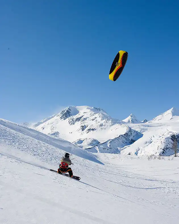 Принцип передвижения с помощью кайта тот же, что при плавании под парусом. Роль воды играет снег, тягу обеспечивает купол площадью в 4-6 квадратных метров. Благодаря современным конструкциям, спортсмен может совершать затяжные метровые прыжки, легко переходящие в полеты, или стремительно двигаться против ветра. При этом кайт помещается в обычный горный рюкзак, не требует лицензии на использование и позволяет развивать скорость более 50 километров в час на относительно ровной поверхности.