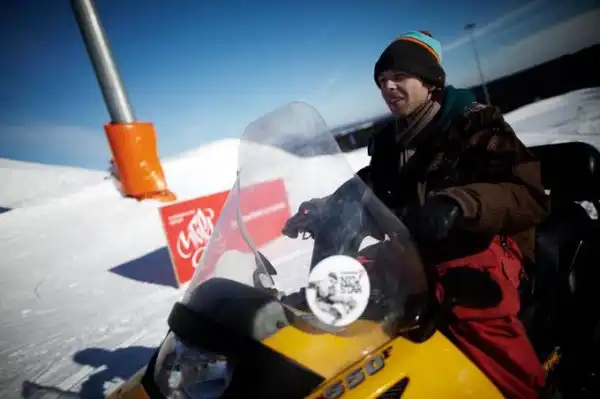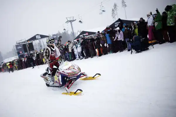 В перерывах между выступлениями райдеров, публика наслаждалась уникальным снегоходным шоу. За рулем 200 килограммовой машины - Caleb Moore, известный во всем мире как один из самых отвязных «пилотов» снегохода.