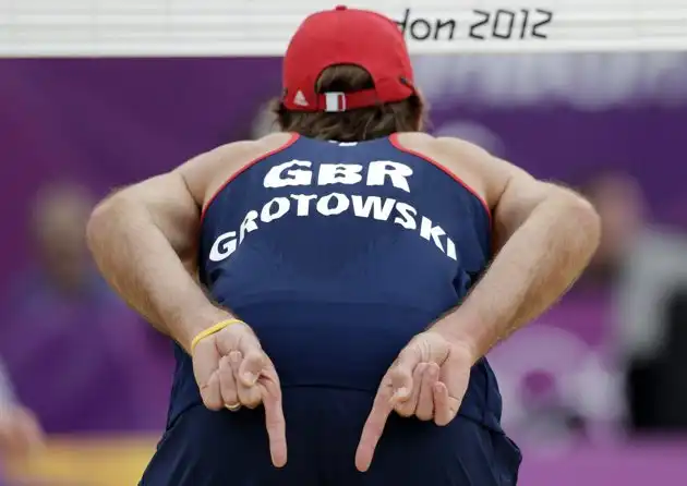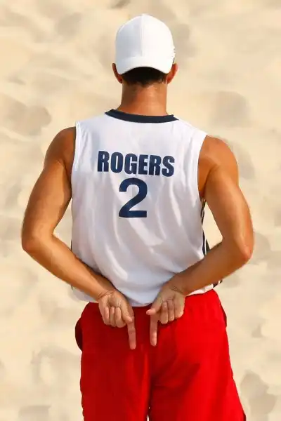 Пекин – 20 августа: Тодд Роджерс, Соединенные Штаты Америки, подает знак своему партнеру по команде во время полуфинального матча против команды Грузии на площадке для пляжного волейбола в парке Чаоян на 12 день Олимпийских Игр 2008 в Пекине.