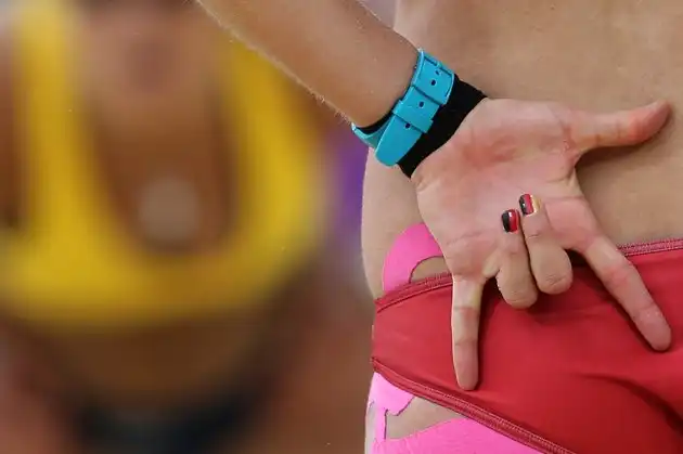 Талита Роча, Бразилия, подает знак партнерше по команде во время матча по пляжному волейболу против команды Германии на Летних Олимпийских Играх 2012, вторник, 31 июля 2012, Лондон.
