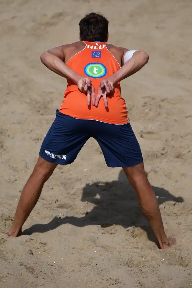 Гаага, Нидерланды – 2 июня: Раиндер Нуммедор, Нидерланды, показывает тактический ход во время четвертьфинального матча между Раиндером Нуммедором и Ричардом Схайлом из Нидерландов и Эмилем Боерсма и Дааном Спийкерсом из Нидерландов на третий день Европейского Чемпионата по пляжному волейболу на гаагском пляжном стадионе, 2 июня 2012, Гаага, Нидерланды. Ричард Схайл и Эмиль Боерсма выиграли 2 – 0.