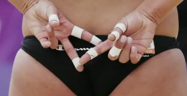 Лилиана Фернандес Штайнер, Испания, показывает одним пальцем вниз, что означает блокирование удара в одну линию.
