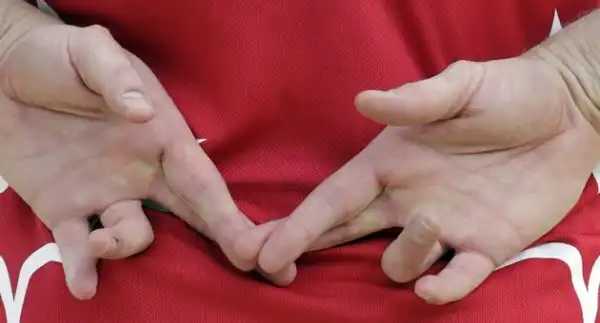 Два пальца, указывающие вниз, означают блокирование удара в линию с двух сторон атаки. Таки образом, в случае любого варианта подачи мяча, игрок блокирует линию атаки, а задний защитник обеспечивает контроль диагонали.