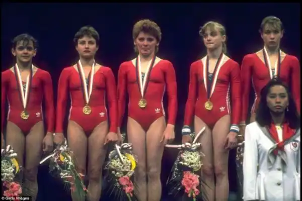 7. 1972: Ольга Корбут, представляющая СССР в Мюнхене, в скромной одежде.