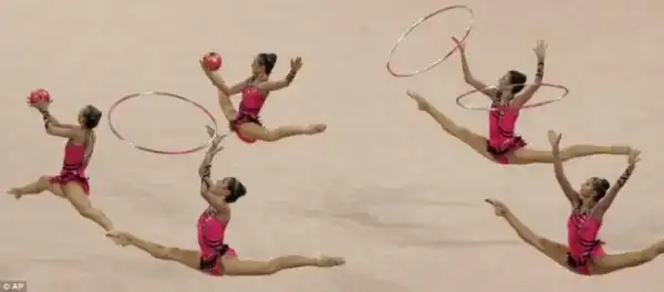 5. Русские гимнастки соревнуются на следующих Олимпийских играх в Хельсинки, Финляндия,1952 г. Как видно, не так много изменений произошло с 1940-х годов. Наряд пятидесятых годов стал купальником с точки зрения современного стиля.