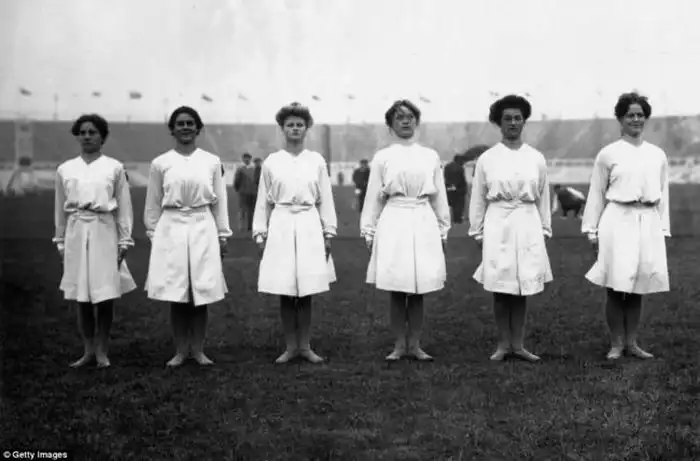 2. Июль 1908: Две девушки из датской сборной выполняют упражнения на «лошади» во время Олимпийских игр в Лондоне. Они одеты в юбку-брюки и рубашки с длинными рукавами.
