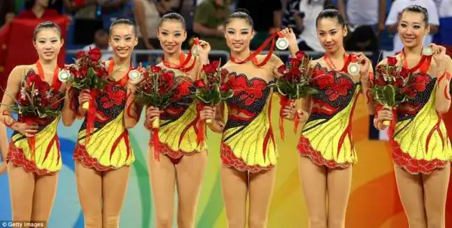14. Серебряные призеры — сборная Китая на подиуме во время пекинских Олимпийских игр 2008 года. Их одежда очень далека от классического спортивного трико.