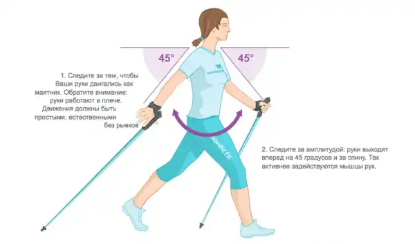 При ходьбе с палками ноги необходимо держать слегка согнутыми, как и при любом другом виде фитнеса. Начальная позиция: правая рука вытянута вперед и держит палку под углом, левая рука свободно лежит на уровне таза и тянется назад. Наступать на землю необходимо сначала пяткой, затем перемещаться на носок, при этом в результате на поверхности должна оказаться вся ступня. Движемся в ритме: правая рука - левая нога, а корпус держим немного под углом, а не строго вертикально.