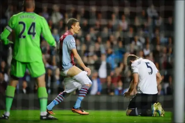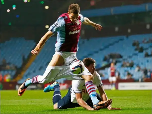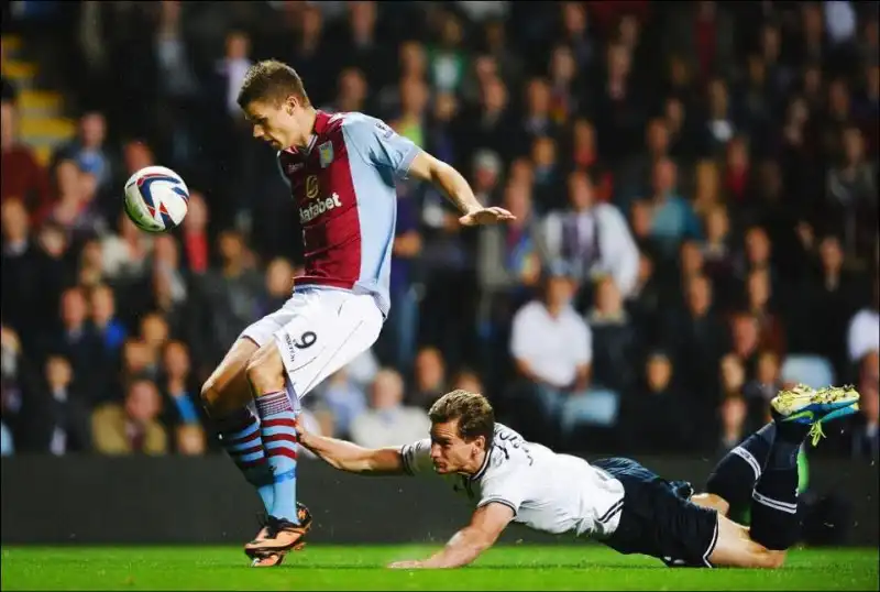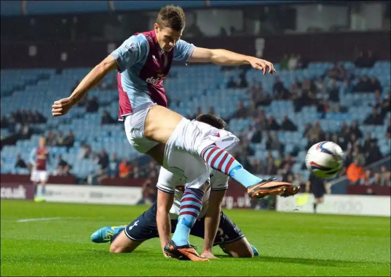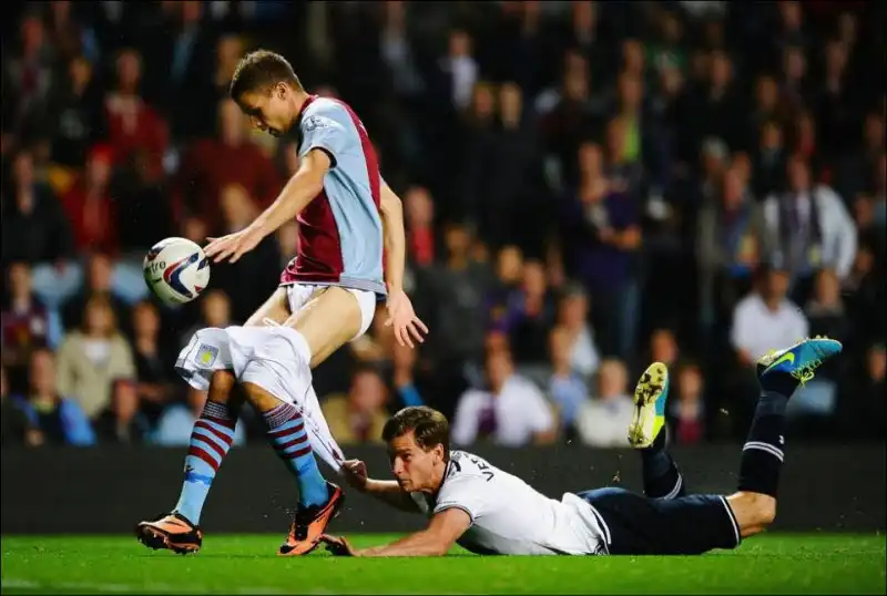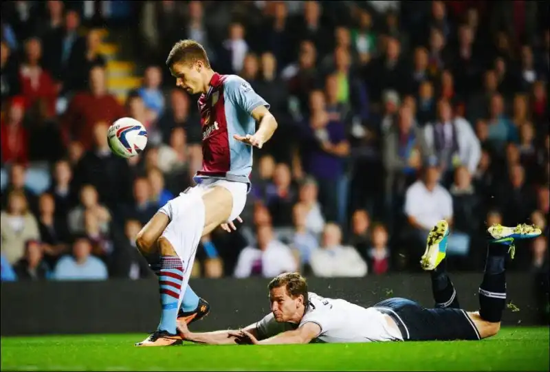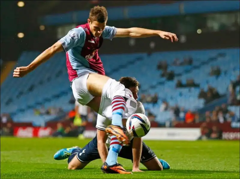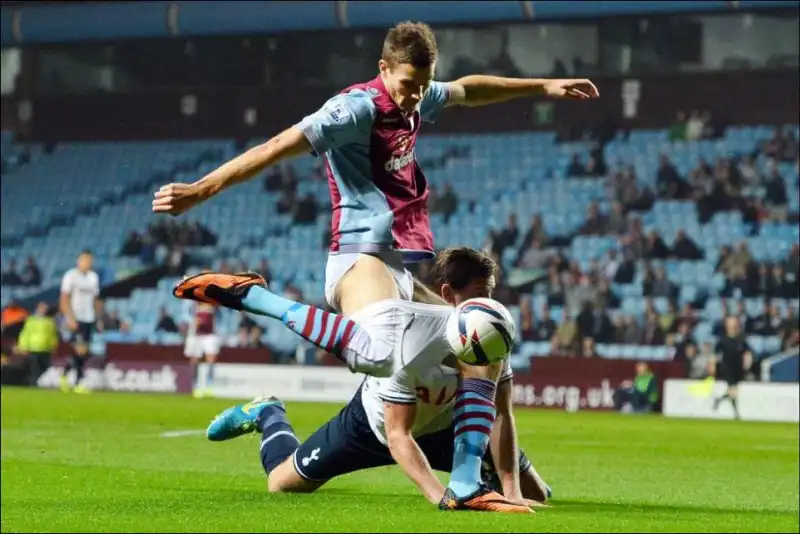 Защитник «Тоттенхэма» постарался любой ценой остановить атаку нападающего «Астон Виллы».
