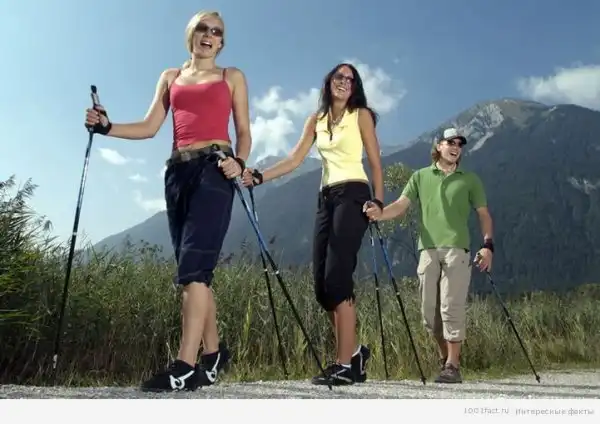 Помимо стандартной, существует еще и нестандартная спортивная ходьба. Один из наиболее популярных видов — Nordic Walking, или скандинавская ходьба. Выглядит она как пешая прогулка с лыжными палками в руках. Только не обычными зимними, а специальными летними – они более прочные и не остроконечные, ведь снега-то нет, втыкать не нужно. Зато эти палки обеспечивают дополнительную нагрузку на верхний плечевой пояс и здорово помогают при движении по пересеченной местности. И вообще, в отличие от обычной ходьбы, задействуют вдвое большее количество мышц тела – до 90%! На сегодня число поклонников скандинавской ходьбы уже перевалило за 3 миллиона.